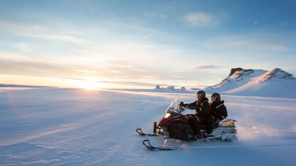 Si eres aventurero como nosotros, una de las mejores experiencias que hicimos en este glaciar fue montar en moto de nieve al atardecer.
